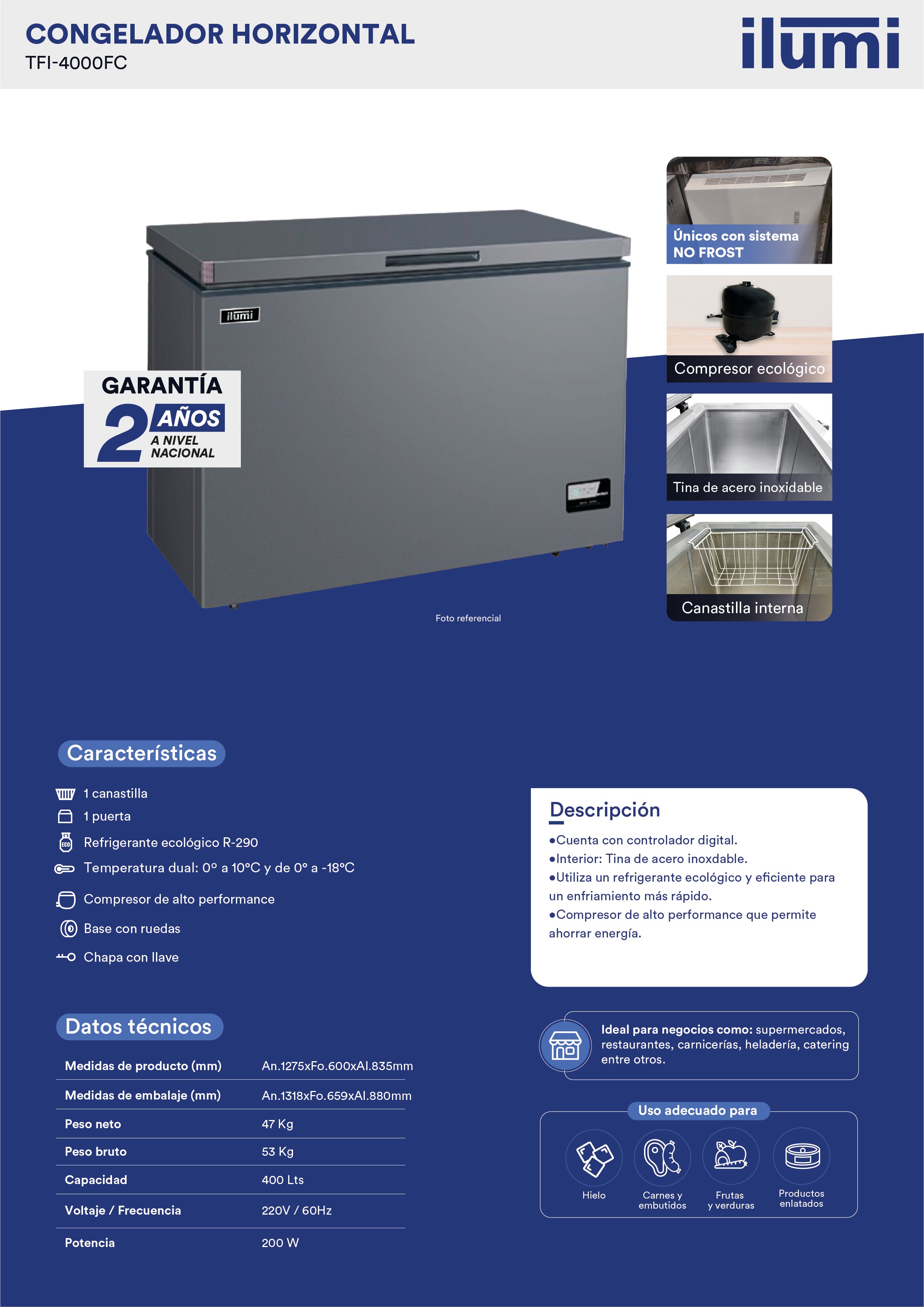 La congeladora horizontal Fan Cooling ofrece una congelación rápida y uniforme gracias a su sistema de aire forzado, evitando la formación de escarcha y manteniendo la temperatura estable en todo el espacio interior. Su diseño robusto, eficiente y de bajo consumo asegura mayor durabilidad y una mejor organización de los productos congelados. Una opción moderna y confiable.