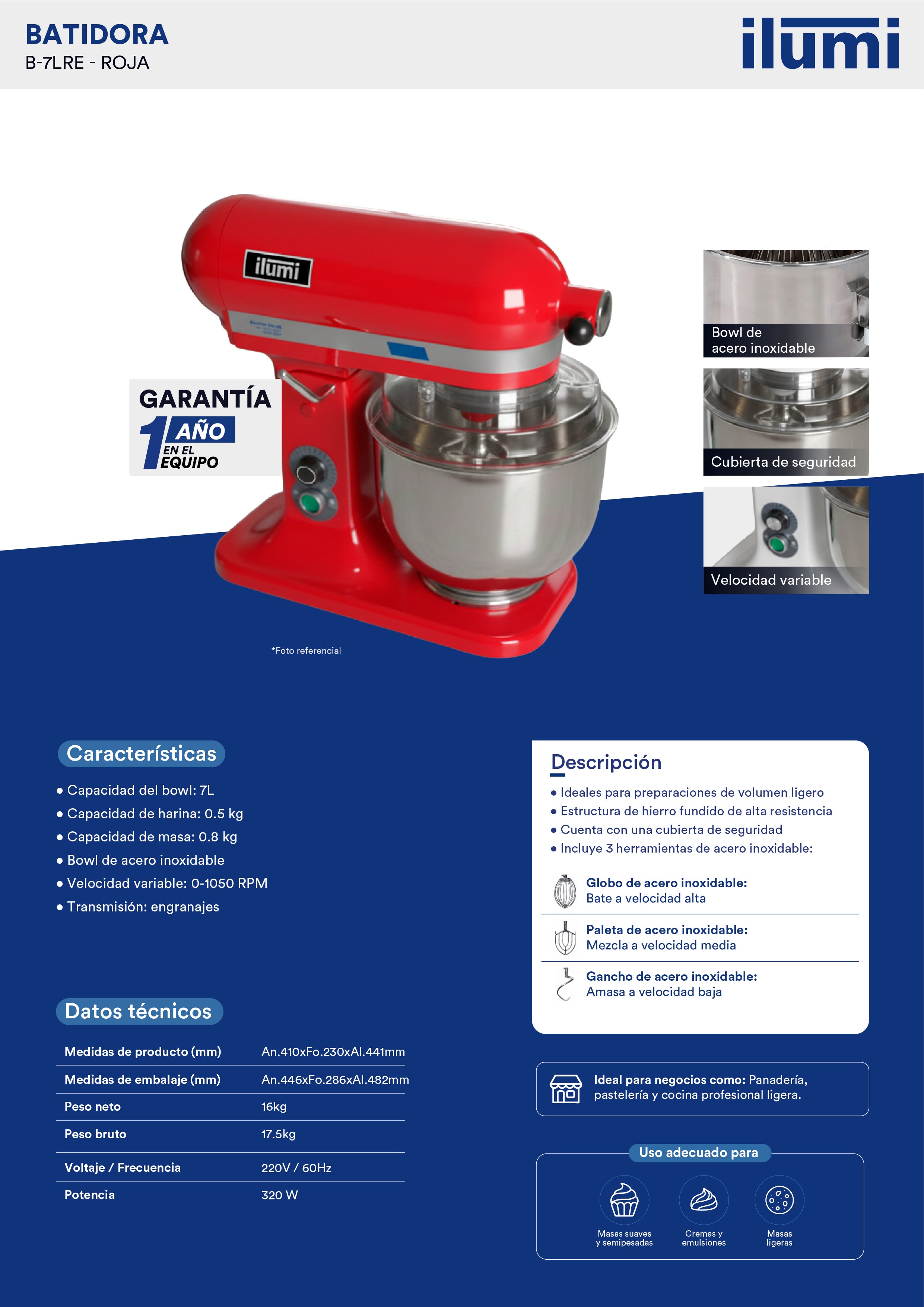 - Capacidad del bowl de 7 litros en acero inoxidable.